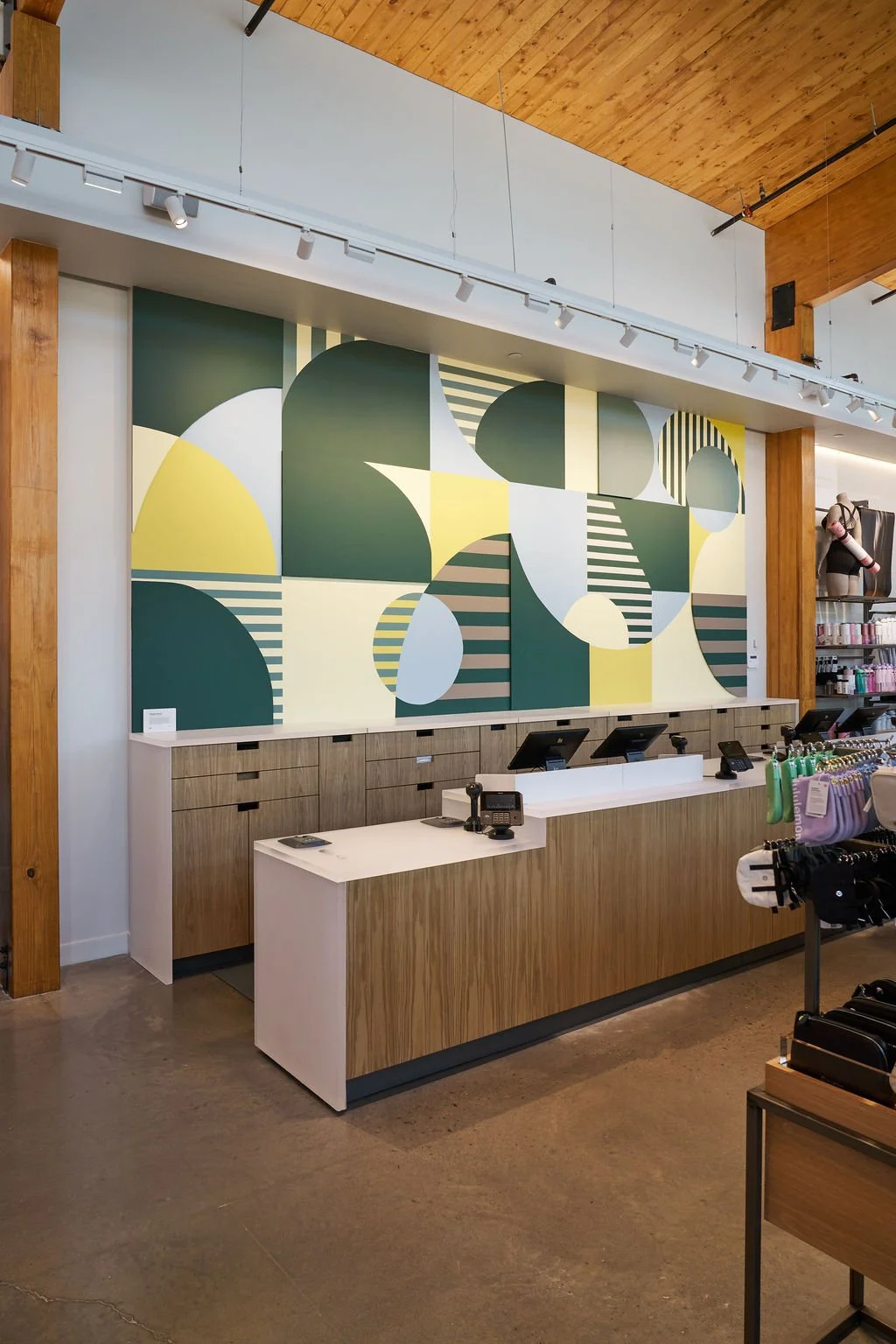 I’m drawn to geometric abstraction for the balance and harmony it brings — both in my work and in my daily life. This piece pairs structure with movement and play through repeating arcs, layered shapes, and staggered stripes. Lululemon’s brand palette anchors the entire piece, giving the energy a grounded, cohesive feel that can be found throughout the store. I also cut select shapes out of MDF and built them up as three-dimensional components. These raised pieces catch light differently throughout the day, adding fun shadows and a ton of dimensionality.