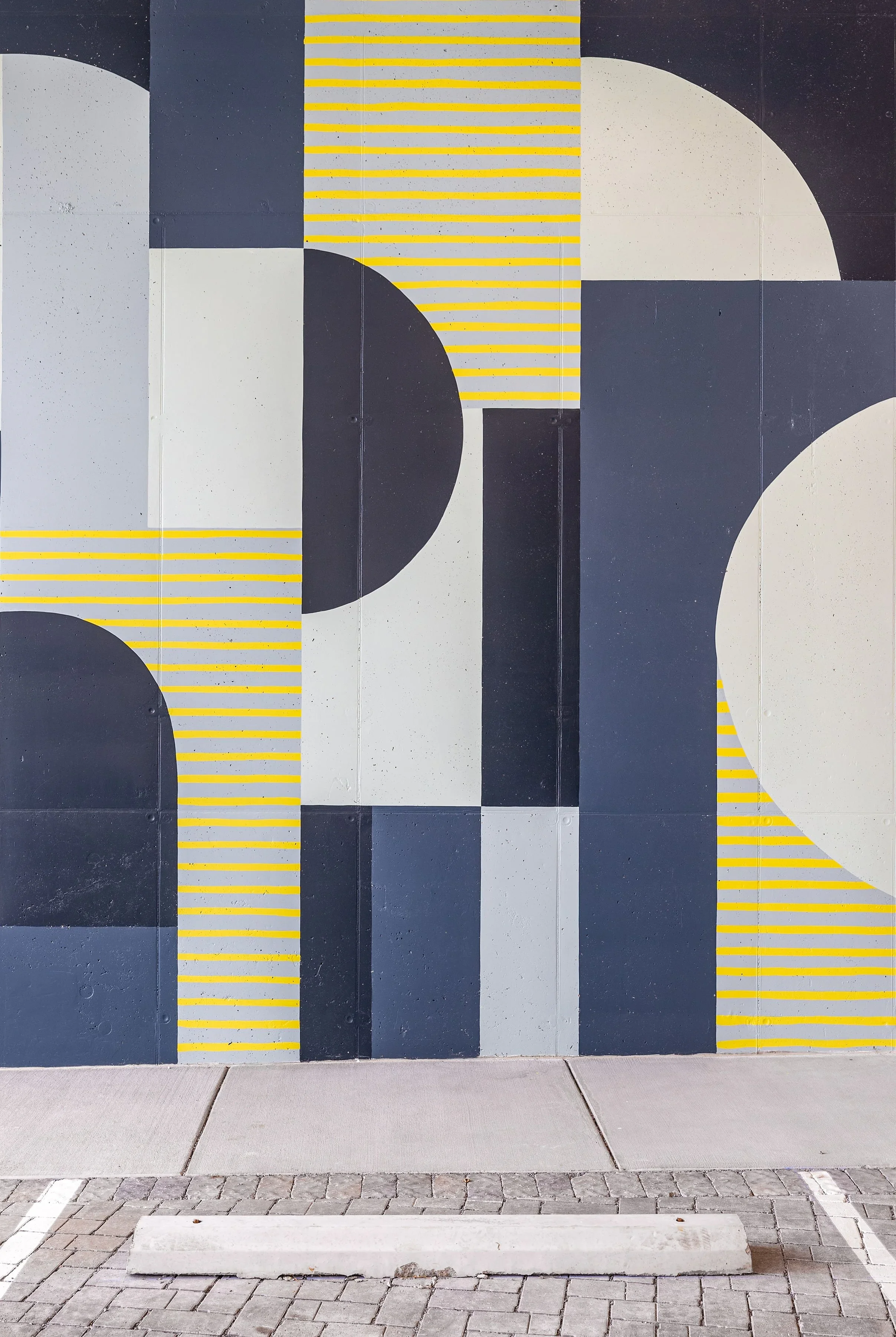 This mural pulls directly from Luna Nashville’s brand language, while still remaining true to my own. Layered half-round forms, vertical striping, and a cool, modern palette wrap around the parking garage creating a composition that feels both architectural and playful — bringing a once boring parking garage to life.